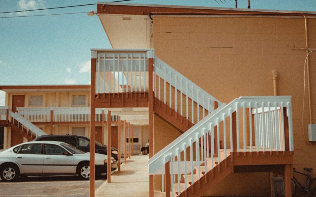 Side view of a motel with stairs and cars parked outside