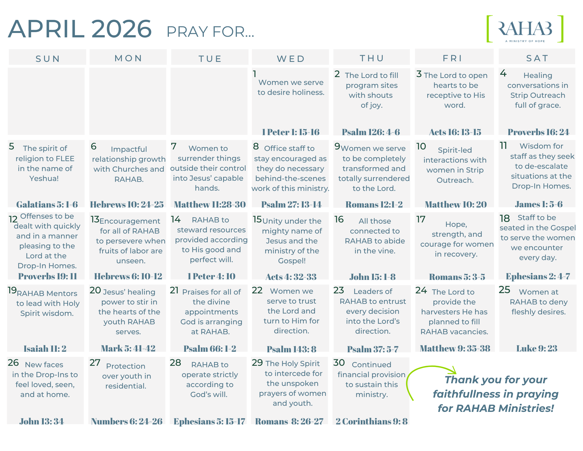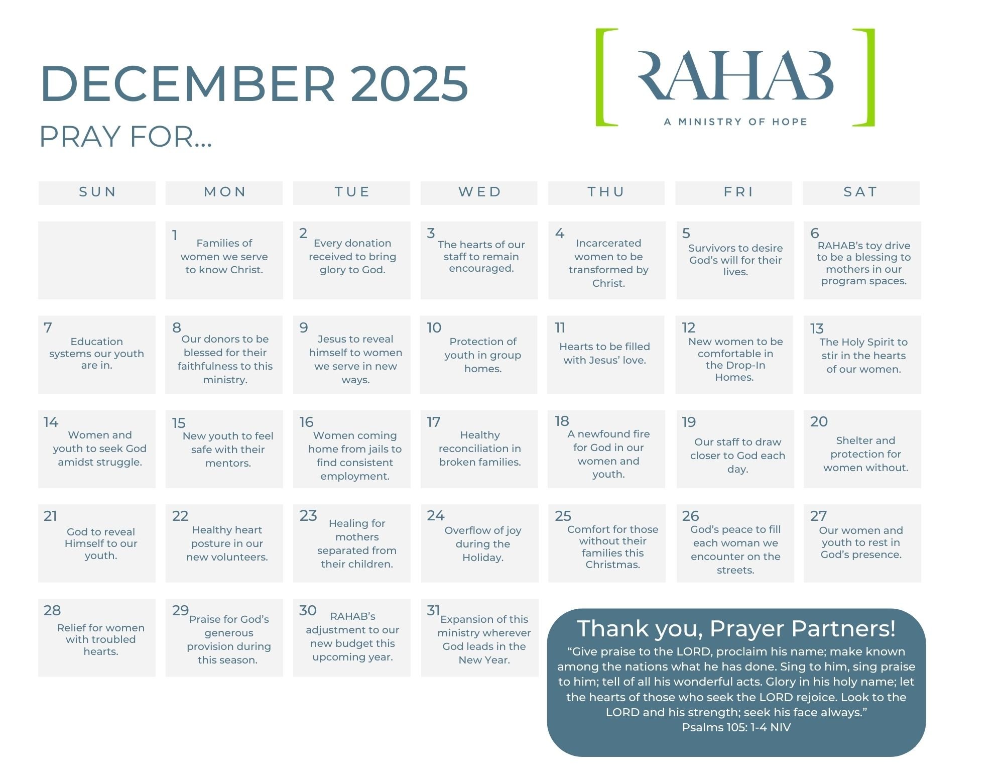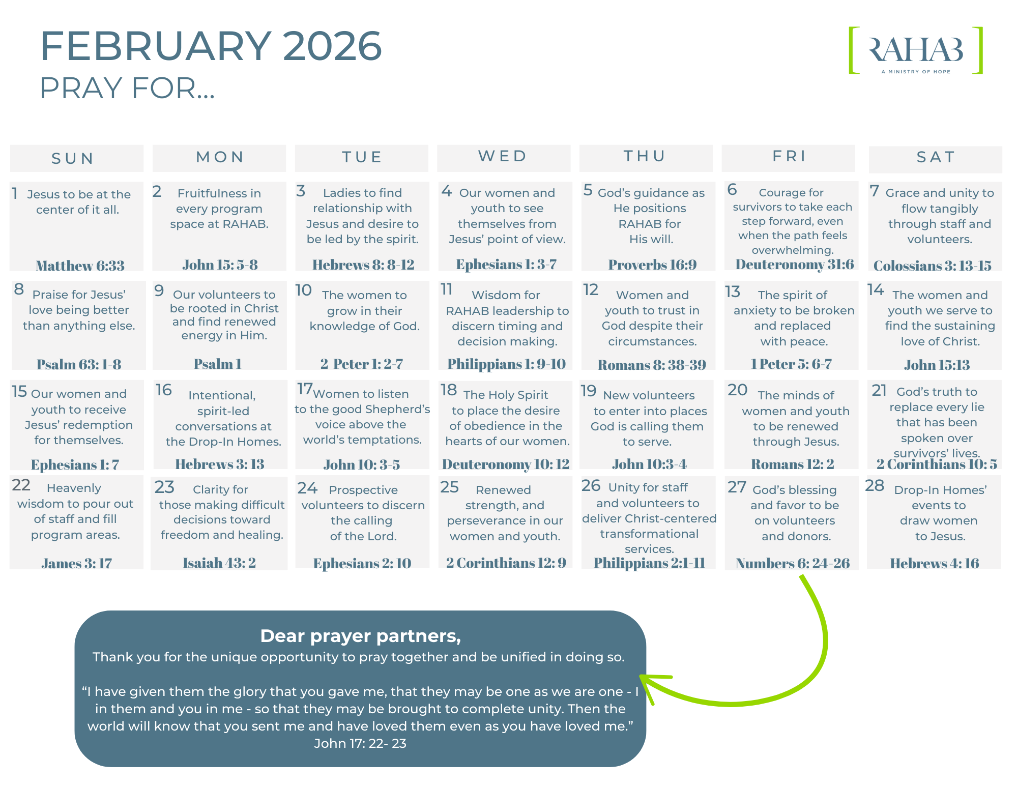 The guidance and provision of the Lord are critical to the work of RAHAB Ministries. Our staff and volunteers are in constant prayer for the human trafficking survivors we serve and the work we get to do. We welcome you to join us in praying for those we serve and the ministry that He has laid before us.