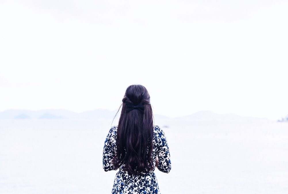 Photo of woman with her back to the camera, in a long dress with long black hair, standing on a stone ledge and looking out into the distance